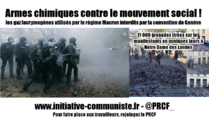 Au moment où Macron justifie par une attaque chimique dont il n’a apporté aucune preuve, le bombardement violant le droit international de la Syrie, il est utile de rappeler que cette débauche de violence contre le mouvement social, déversant des grenades lacrymogènes par dizaines de milliers sur les travailleurs de France, jeunes, étudiants, infirmières, agriculteurs, cheminots défendant leurs droits, est en fait une utilisation massive d’armes chimiques interdites par la convention de Genève, convention internationale interdisant les armes chimiques.